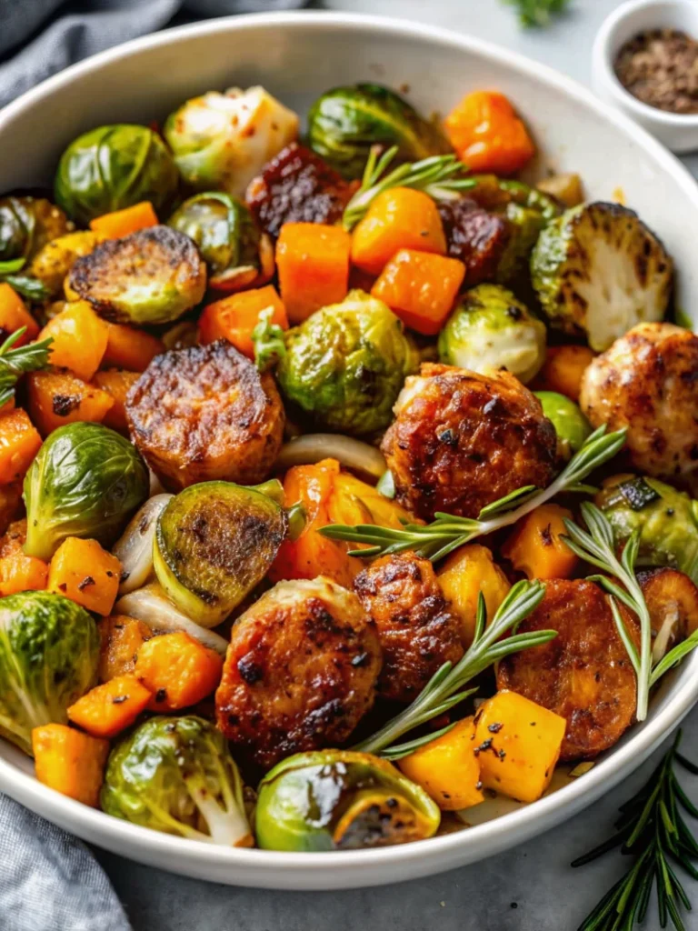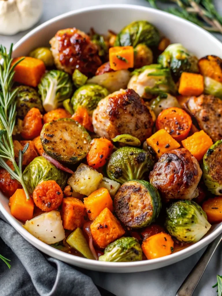 A quick and healthy sheet pan dinner featuring roasted sweet potatoes, Brussels sprouts, and chicken apple sausage, all caramelized to perfection in just 30 minutes. The ultimate fall comfort food solution for busy weeknights.