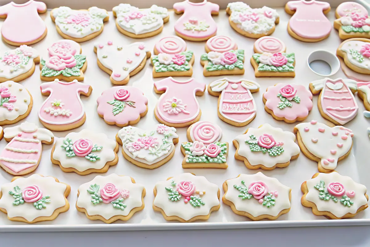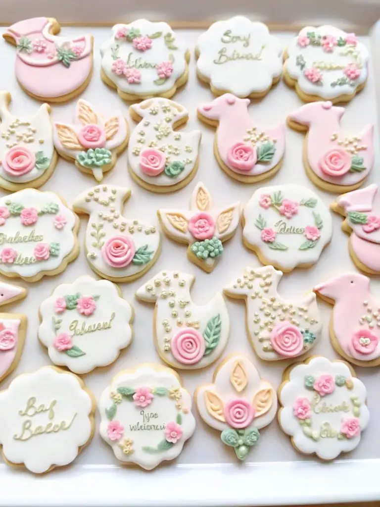 Beat powdered sugar, meringue powder, and 4 tablespoons warm water until thick and glossy. Adjust with more water for flooding consistency. Tint with gel colors for pastel shades, and transfer to piping bags. This step is where the magic happens—turning plain cookies into Baby in Bloom masterpieces.