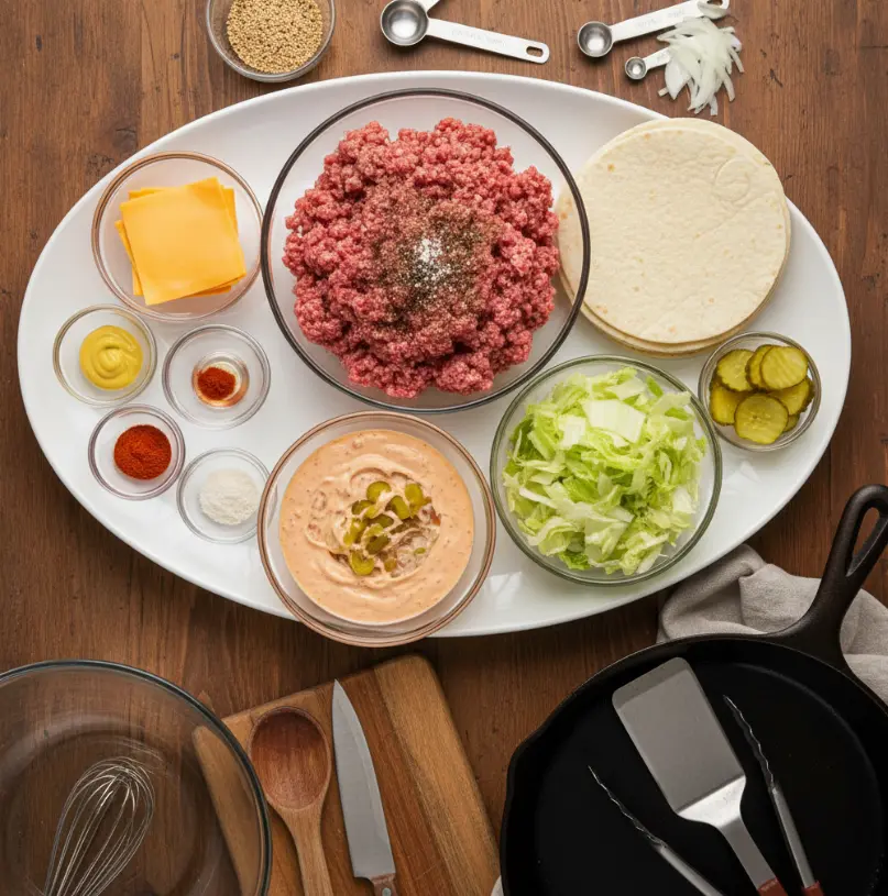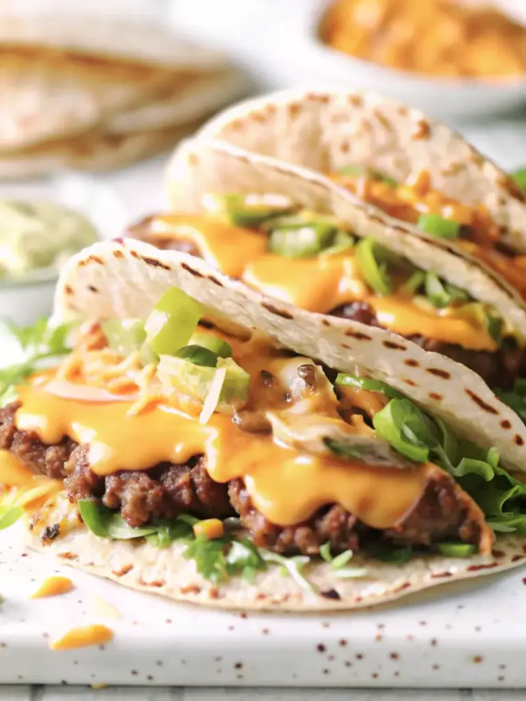 Big Mac Style Smash Burger Tacos are a viral fusion recipe combining crispy smash burger beef with soft flour tortillas and classic Big Mac flavors. Juicy seasoned beef, melted American cheese, shredded lettuce, pickles, and creamy special sauce come together for an easy, fast, and crave-worthy dinner.