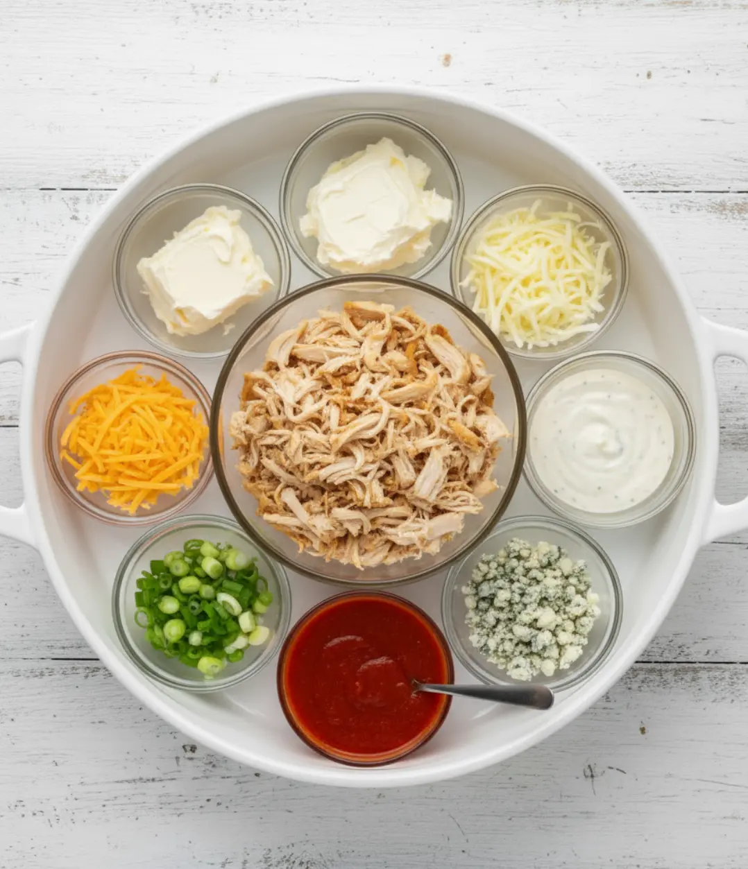 - 1/2 cup ranch dressing – This creates the signature buffalo-ranch flavor profile. You can also substitute blue cheese dressing for a more intense, tangy version.
