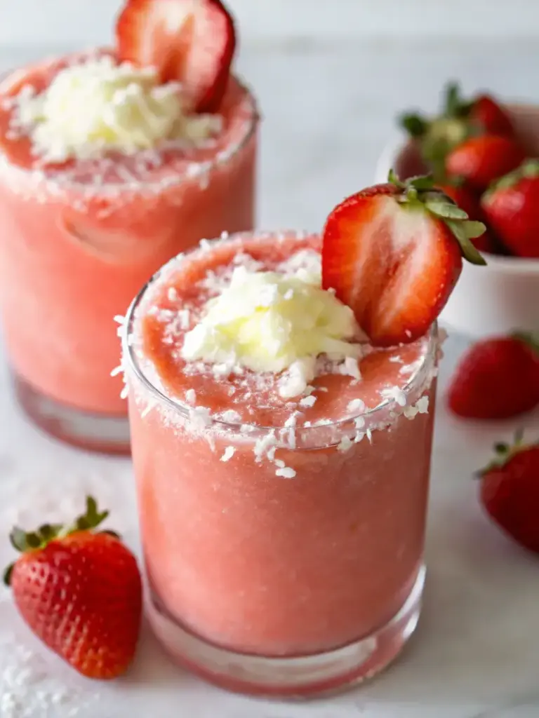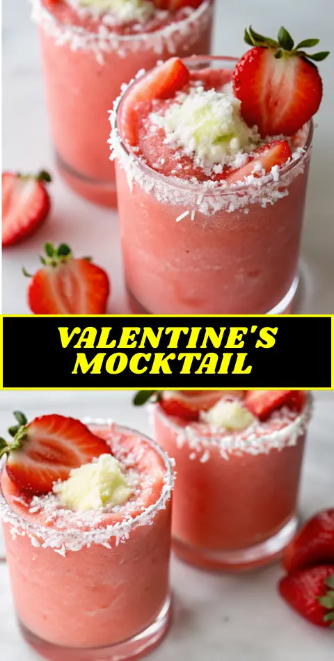 A refreshing and romantic Valentines mocktail made with strawberries, coconut milk, and pineapple juice, perfect for a festive non-alcoholic celebration.