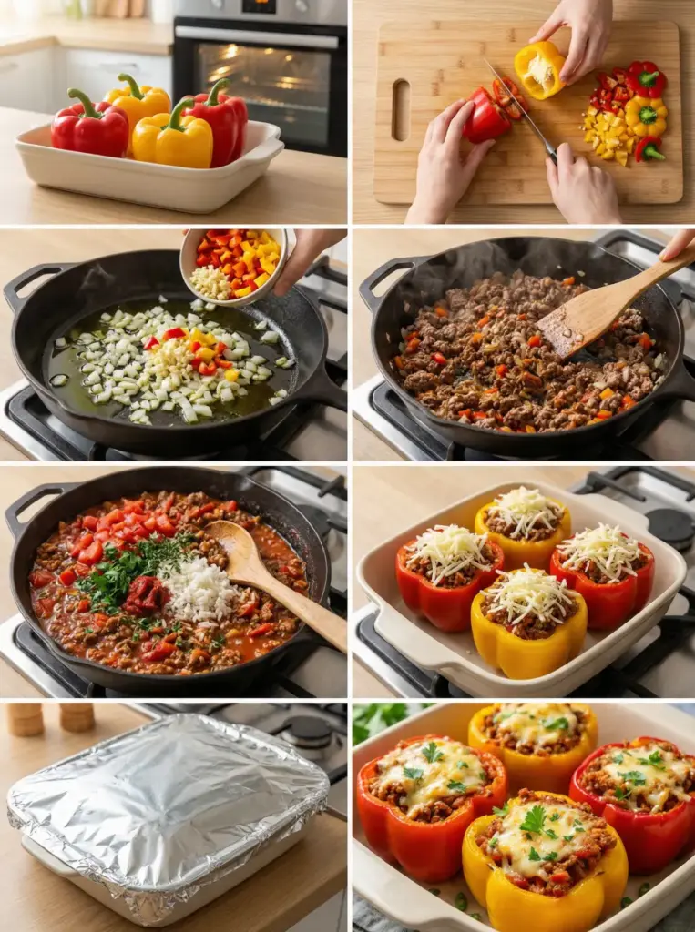 Preheat your oven to 375°F (190°C). Choose a baking dish just large enough to hold the peppers upright (cut-side up) so that they don’t tip over. This prevents tipping and ensures even cooking throughout.