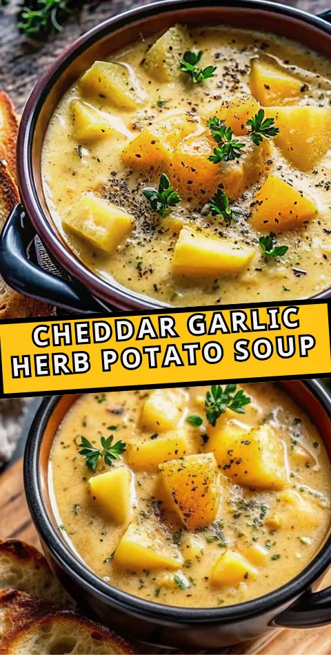 Keywords: potato soup, cheddar potato soup, garlic herb soup, comfort food, creamy soup recipe