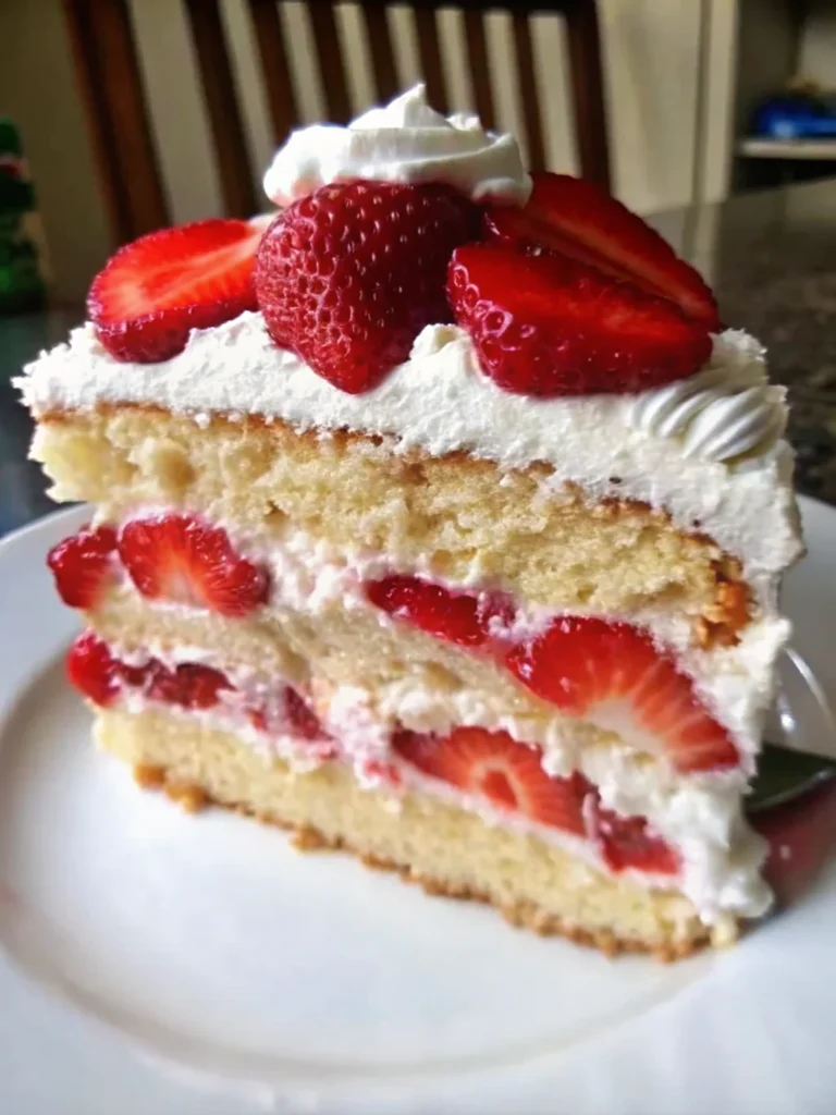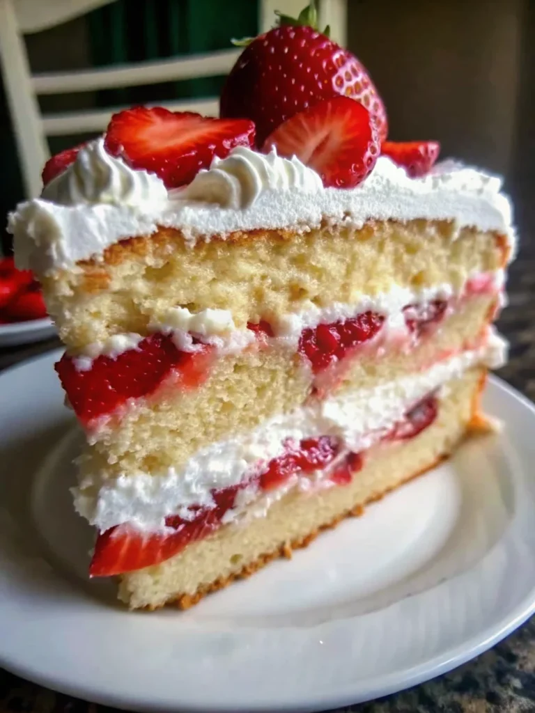 Place one cake layer on your serving plate. Spread half the whipped cream evenly across the surface, then arrange half the macerated strawberries on top. Add the second layer and repeat with remaining cream and strawberries.