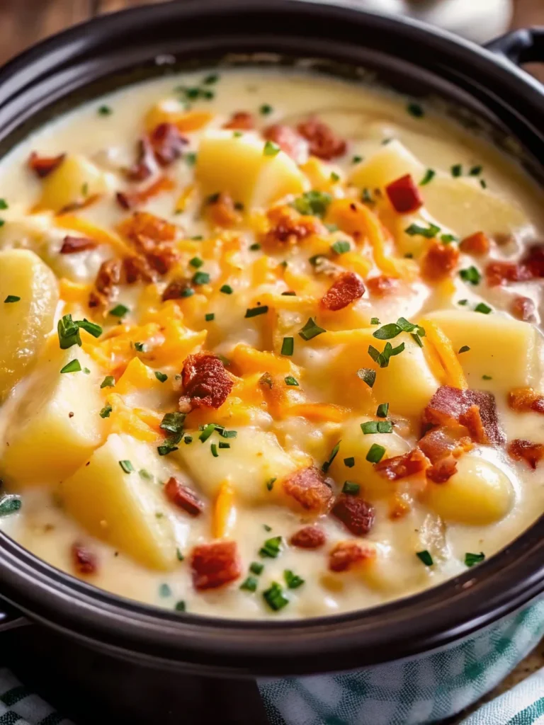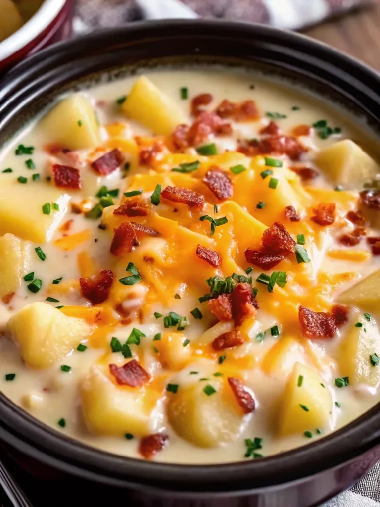 A foolproof crock pot crack potato soup recipe made with creamy potatoes, ranch seasoning, bacon, and cheddar cheese. This slow-cooker comfort food is irresistibly rich, hearty, and perfect for any occasion.
