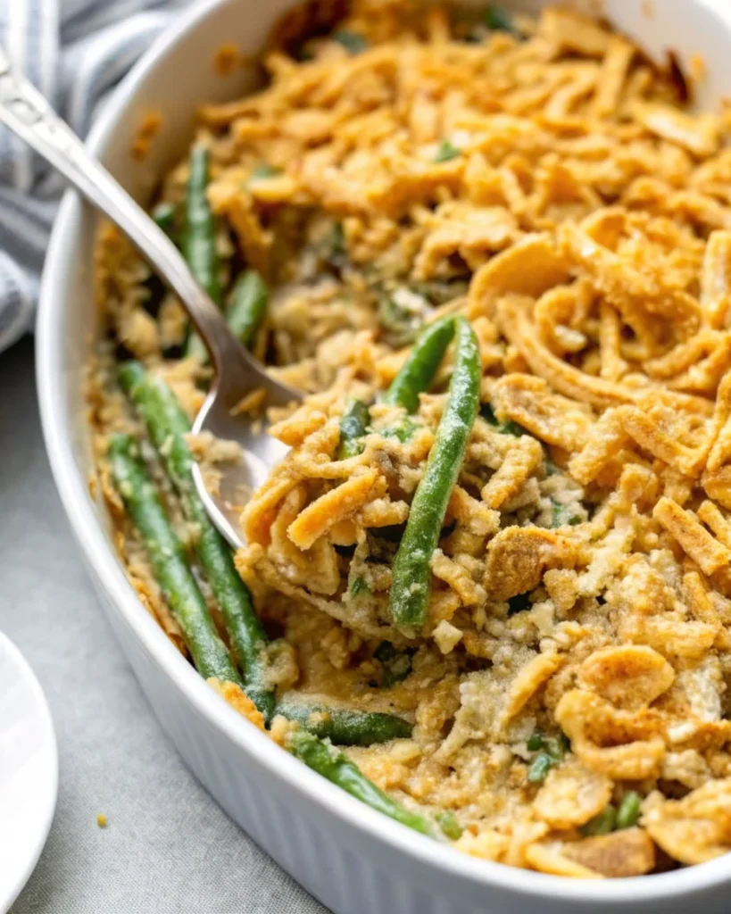Always pat green beans dry after blanching to prevent watery casserole. Add crispy onions only after baking for best crunch. Can be made ahead and refrigerated up to 3 days before baking. Perfect for Thanksgiving, potlucks, or family dinners.