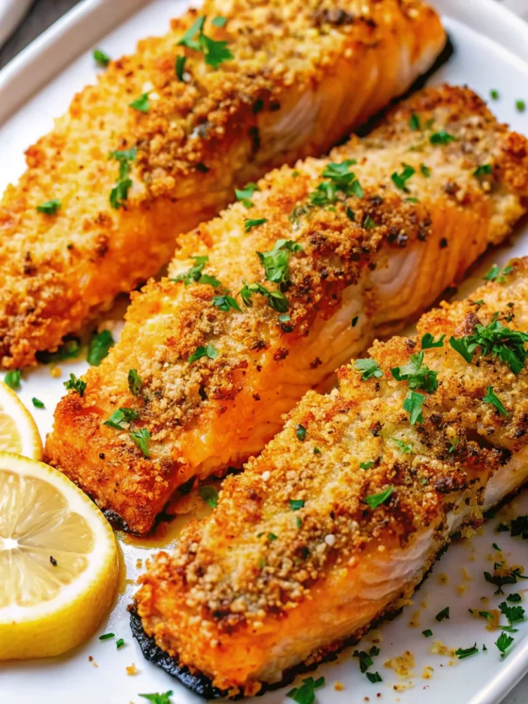 Crispy Parmesan crusted baked salmon recipe with golden brown coating on a white plate garnished with lemon wedges and fresh parsley, showing flaky fish interior