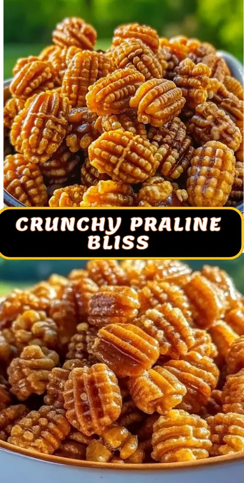 Keywords: praline crunch, caramel pecan snack, praline mix, sweet and salty snack, easy holiday treat, crunchy praline recipe