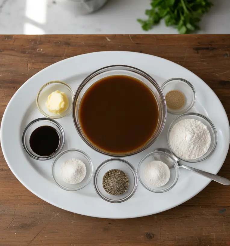 - Gradually pour in beef broth while whisking to avoid clumps. Add Worcestershire sauce and garlic powder.