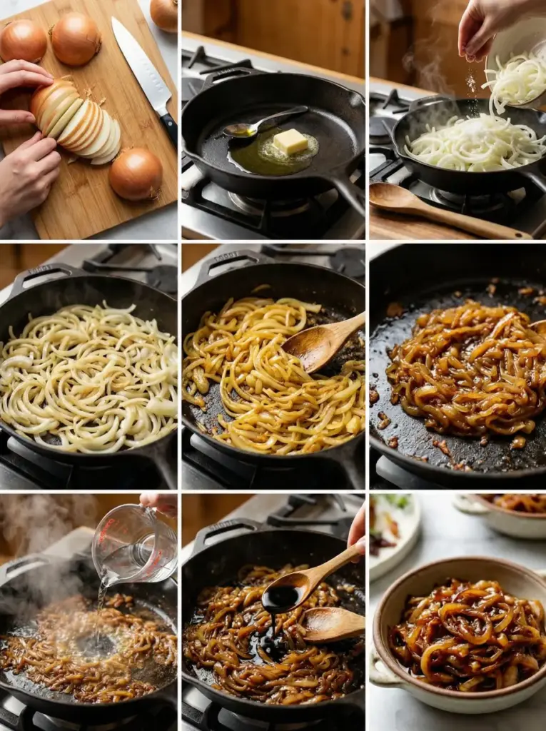 Slice your onions pole-to-pole (from root to stem) into ¼-inch thick strips. Aim for the slices to be as even as possible so that they cook at the same rate. Before you add them to the pan, separate the onion layers. This technique ensures uniform cooking and prevents some pieces from burning while others remain undercooked.