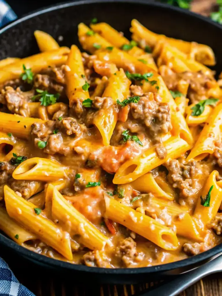 Keywords: creamy beef pasta, cozy pasta recipe, 30 minute pasta, beef penne, comfort pasta