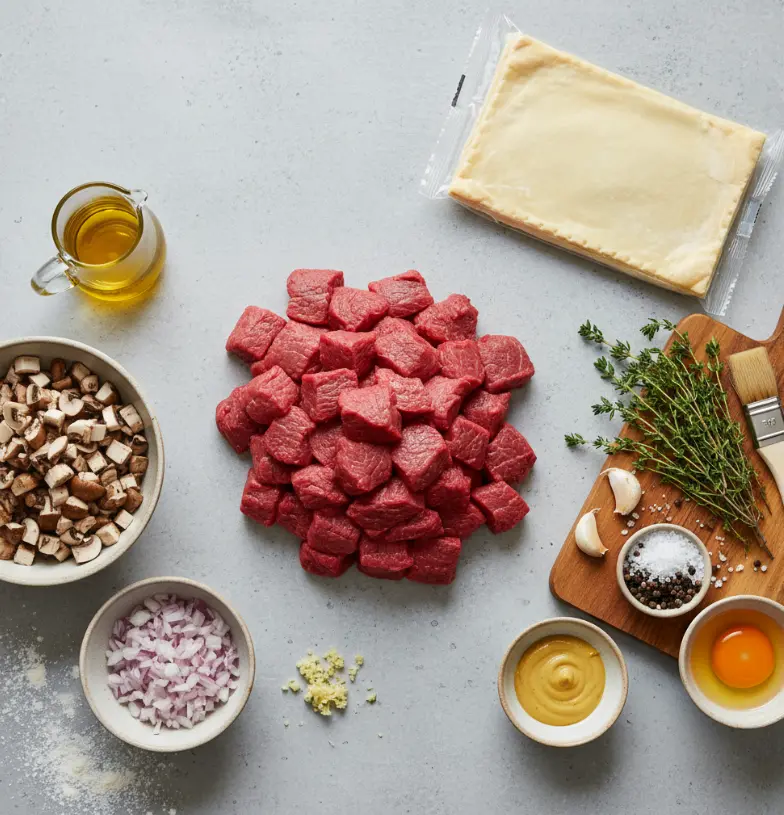 - Prepare the Mushroom Duxelles: In the same pan, cook mushrooms, shallots, and garlic for 5–7 minutes until moisture evaporates. Stir in thyme, season, and cool completely.