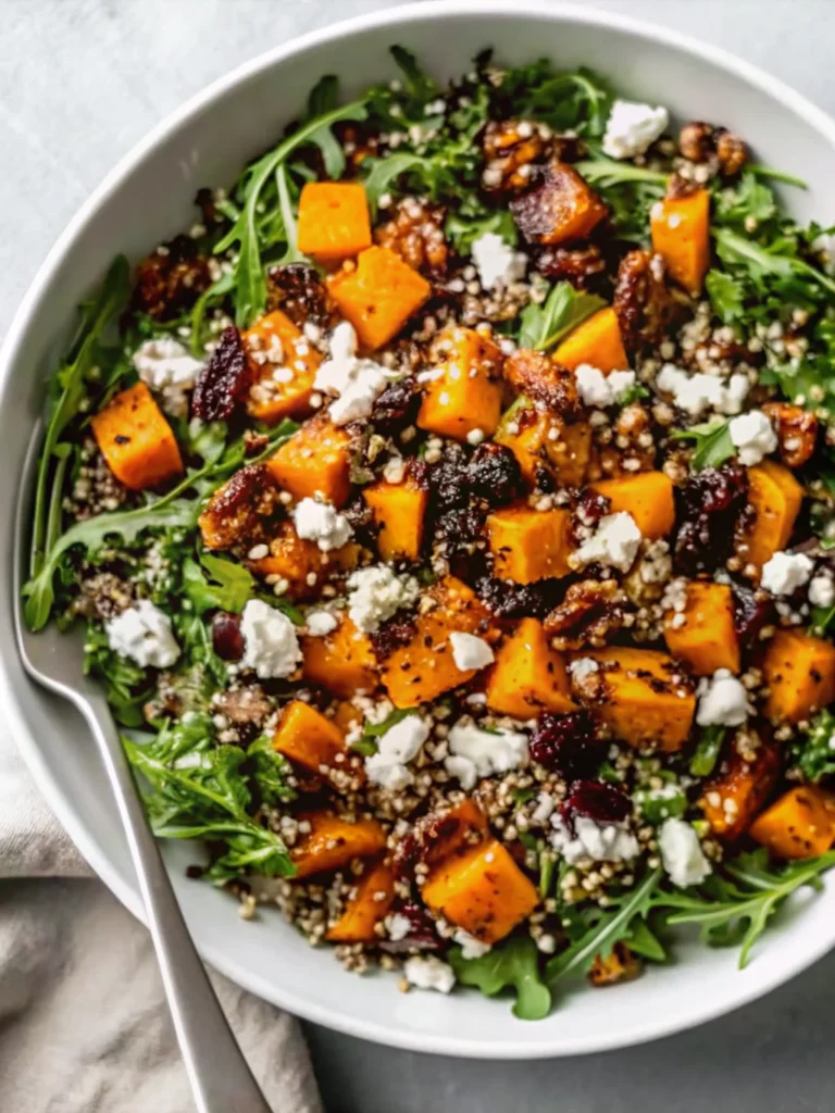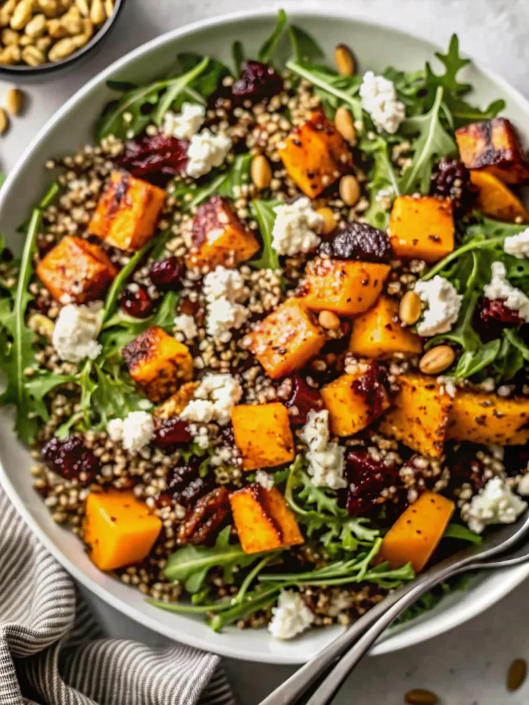 In a large serving bowl, combine the baby arugula, fluffy quinoa, and warm roasted pumpkin. The slight warmth from the pumpkin gently wilts the arugula edges while maintaining the leaves’ fresh texture. Top with crumbled feta, dried cranberries, and toasted walnuts.