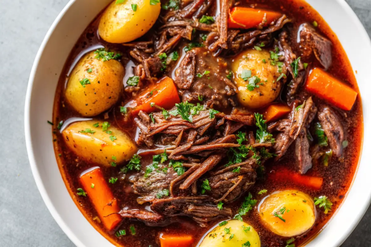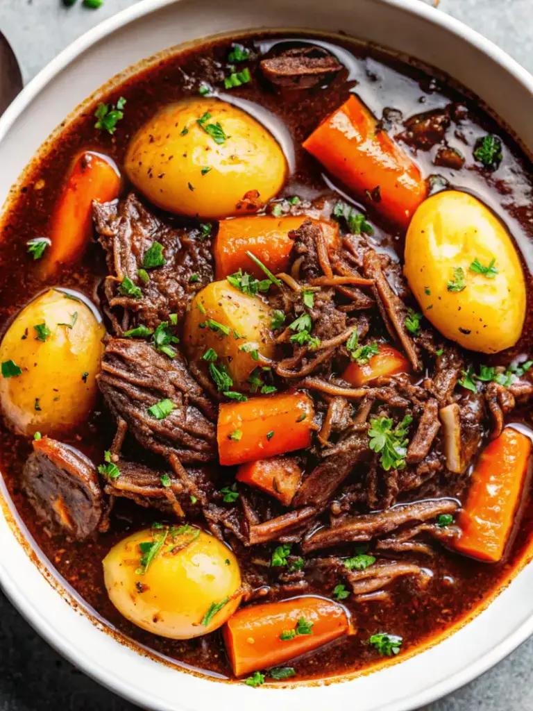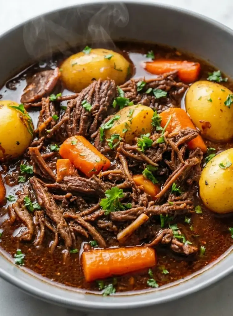 Once done, shred the meat with forks—it should fall apart effortlessly. Stir in veggies, remove the bay leaf, and garnish with fresh parsley. Serve hot for that ultimate easy slow cooker dinner experience.