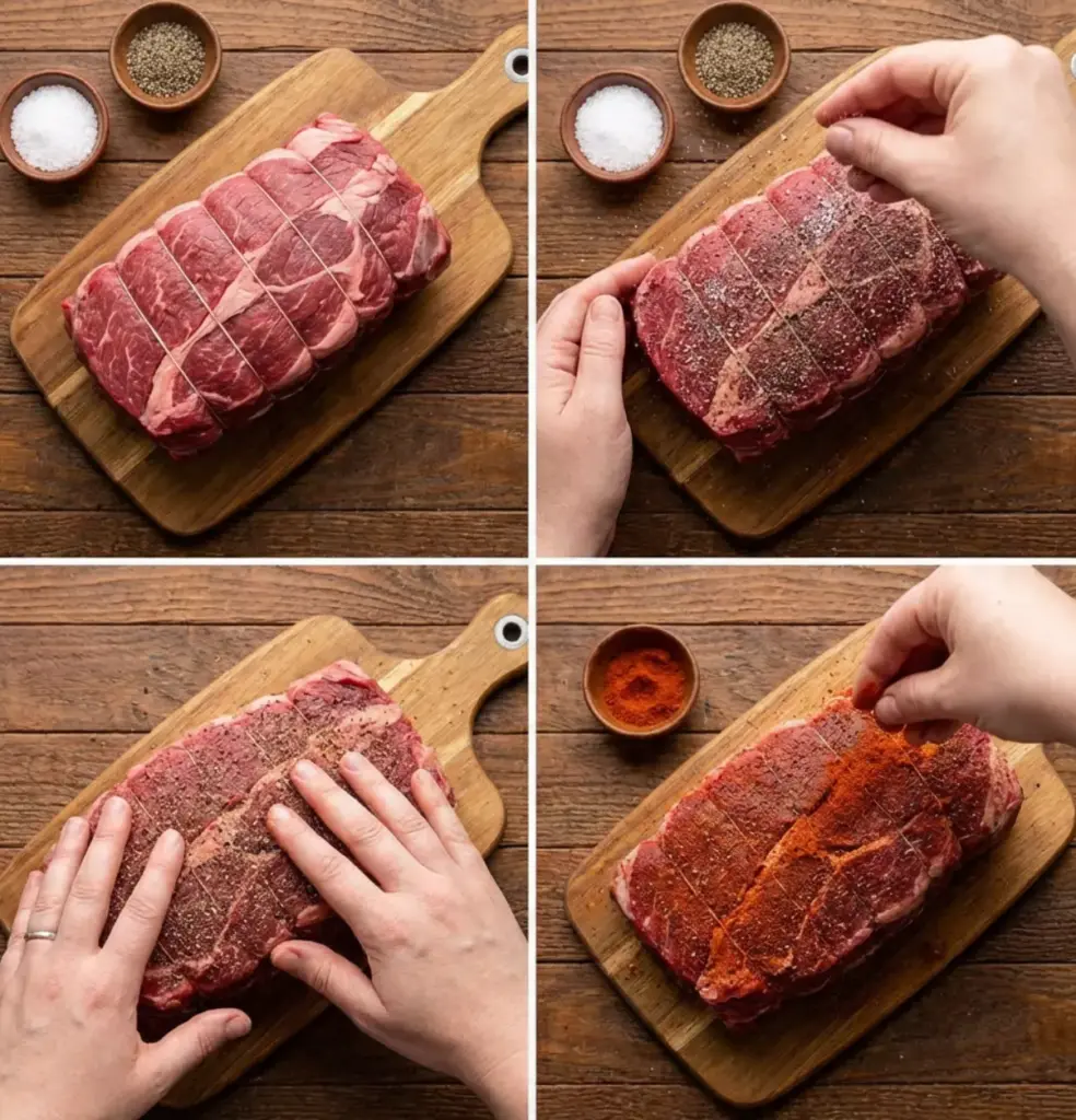 - Season the chuck roast with salt and black pepper, rubbing evenly for full coverage.