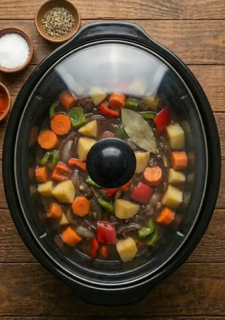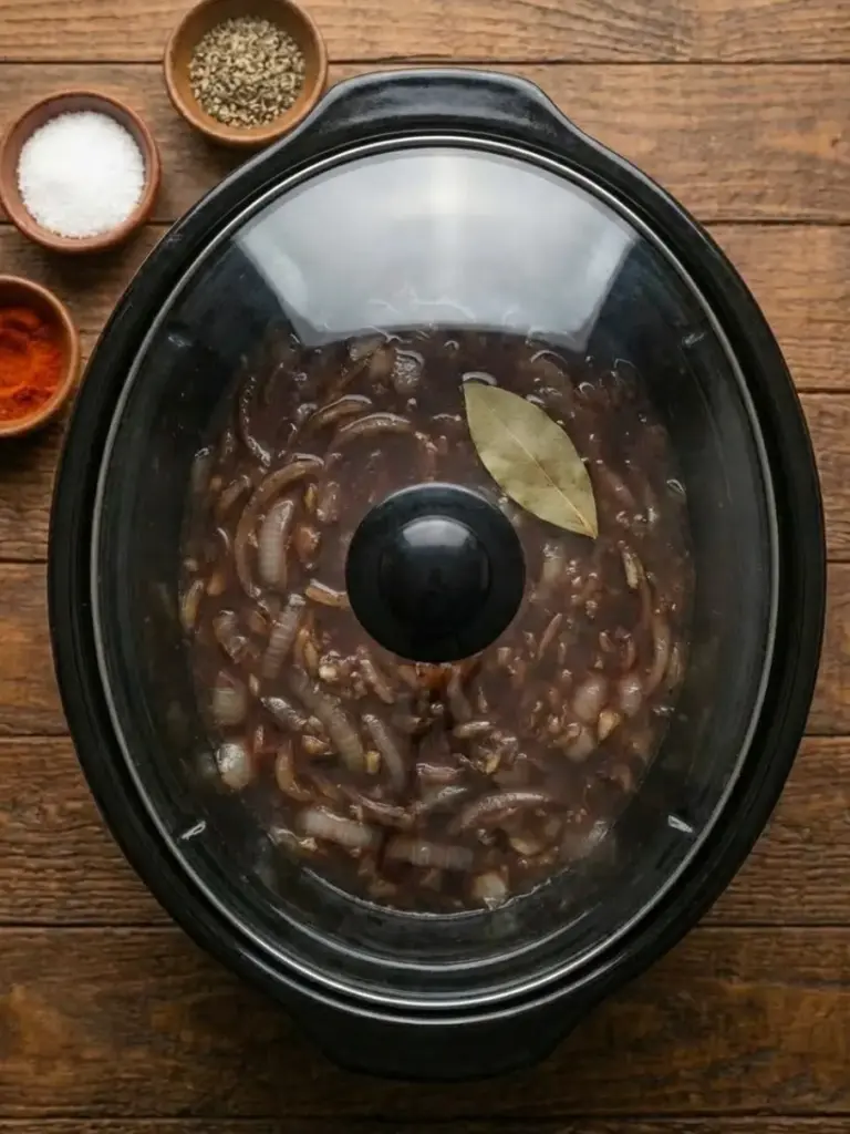 Stir in 2 cups beef broth and add 1 bay leaf to the slow cooker. Cover and cook on low for 6-8 hours or high for 3-4 hours. This low-and-slow method tenderizes the meat, with data from USDA showing it breaks down collagen by 80% for melt-in-your-mouth texture.