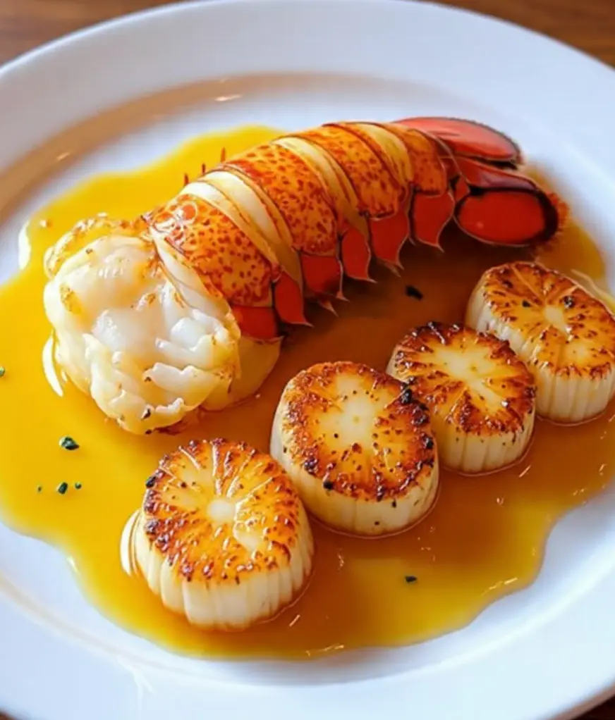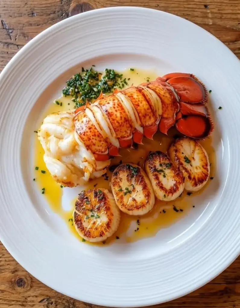 Tender lobster tails and golden seared scallops coated in rich garlic butter, finished with fresh parsley and lemon for a restaurant-quality seafood dinner at home.