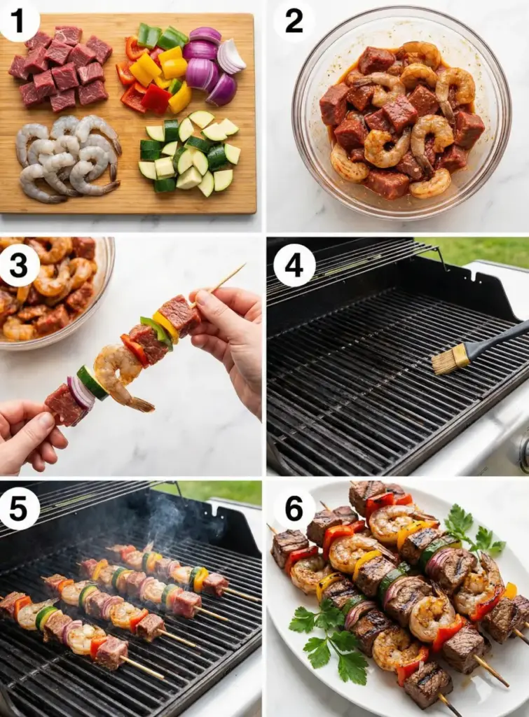 Thread the steak, shrimp, and vegetables onto skewers, alternating each item to allow the flavors to meld during grilling.