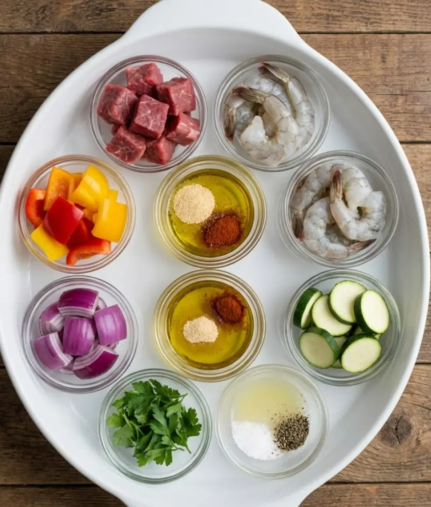 Start by cutting the steak into 1-inch cubes. Then, peel and devein the shrimp, leaving the tails on for a more elegant presentation. Slice the bell peppers, red onion, and zucchini into similarly sized chunks to ensure they cook evenly.