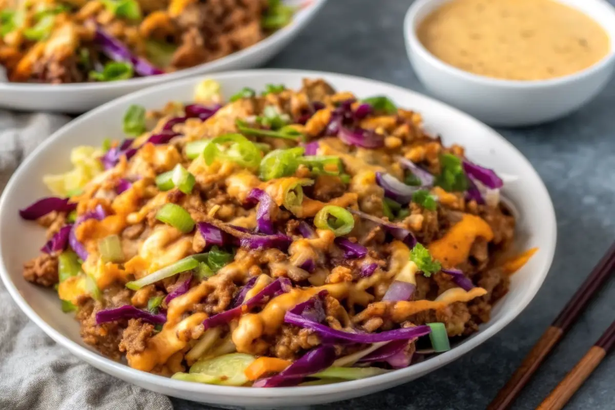 This Egg Roll in a Bowl with Creamy Chili Sauce transforms the classic takeout favorite into a wholesome, 20-minute one-pan meal loaded with savory ground meat, crisp vegetables, and a luscious chili sauce.