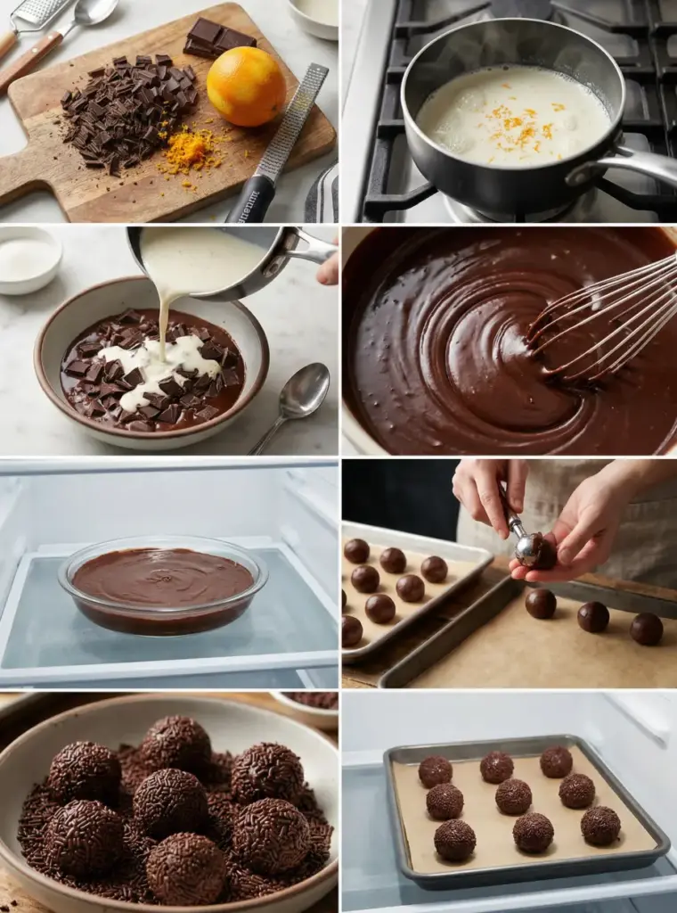 Line a baking tray with parchment paper and place your chocolate sprinkles in a shallow bowl nearby. In a small saucepan, combine the cold heavy cream with the fresh orange zest. Heat gently over medium heat until tiny bubbles form around the edges—resist the urge to let it boil, as this can scorch the cream and create a grainy texture.