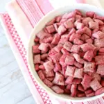Keywords: red velvet puppy chow, puppy chow recipe, red velvet snack mix, no bake dessert, valentine snack