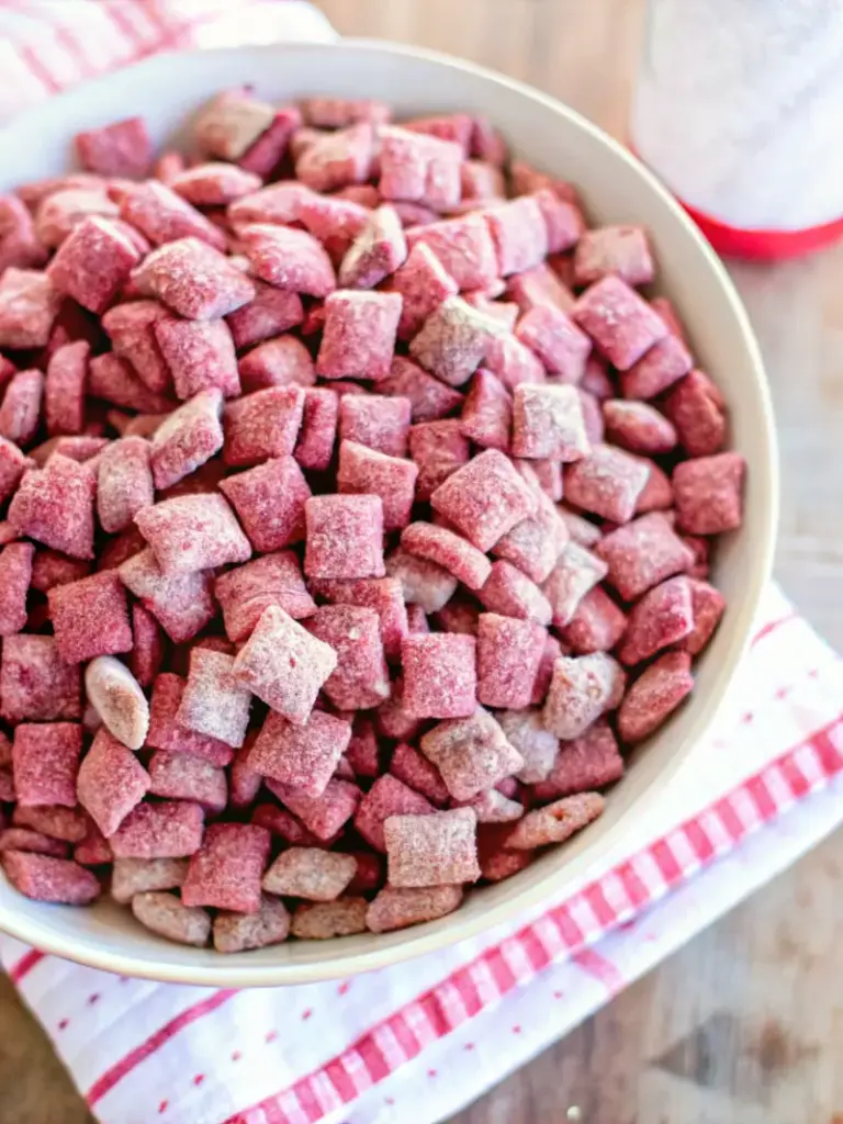 Red Velvet Puppy Chow is a quick and festive no-bake snack made with chocolate, peanut butter, and crunchy Chex cereal coated in a vibrant red velvet finish. Perfect for Valentine’s Day parties, holidays, or easy sweet snacking.
