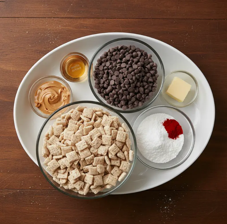 These ingredients come together in a symphony of flavors—chocolatey depth from the chips, nutty creaminess from the peanut butter, and a buttery smoothness that coats every Chex piece. Pro tip: If you’re personalizing for a crowd, double the red food coloring for an extra vibrant hue, turning this into a showstopper red velvet snack mix for holidays.