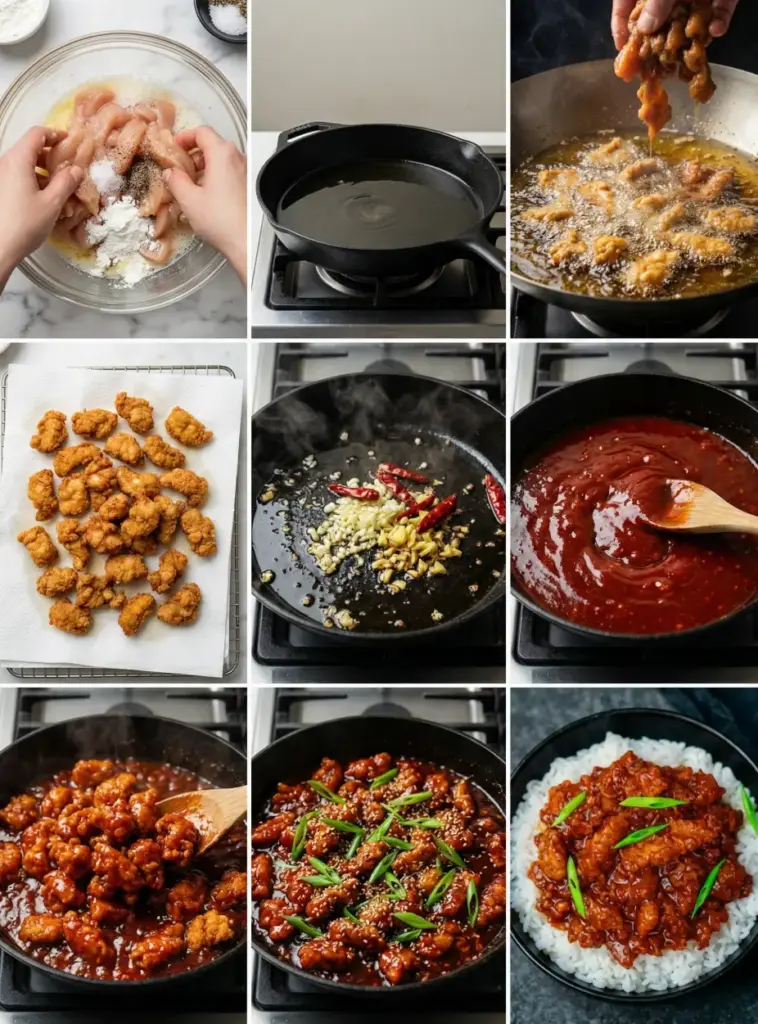 - Mix chicken with egg white, cornstarch, salt, and black pepper and marinate 10–15 minutes.