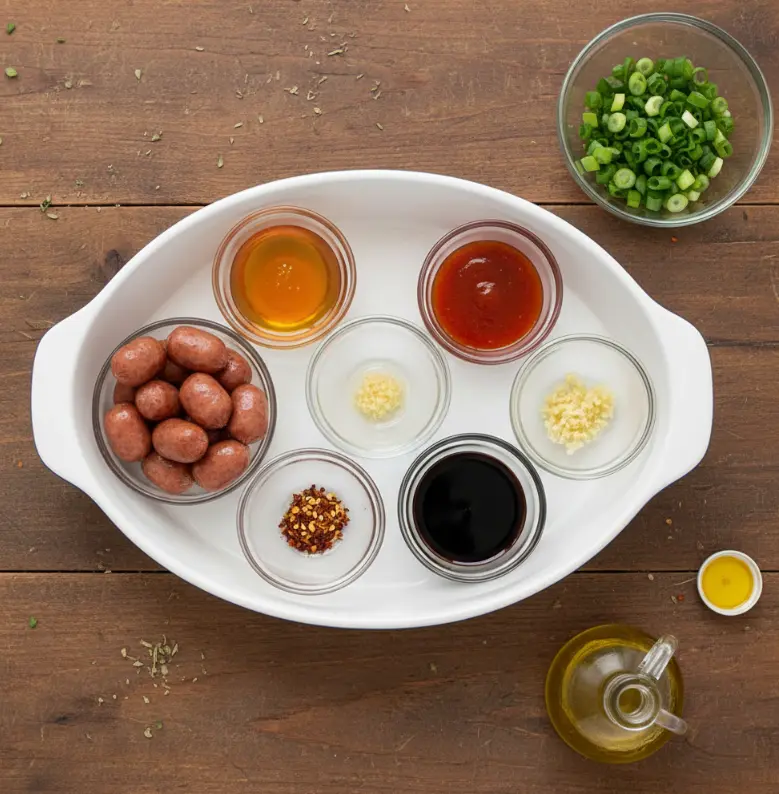 This Hot Honey Garlic Lil Smokies Recipe requires simple yet impactful ingredients that create layers of sweet, spicy, and savory flavors: