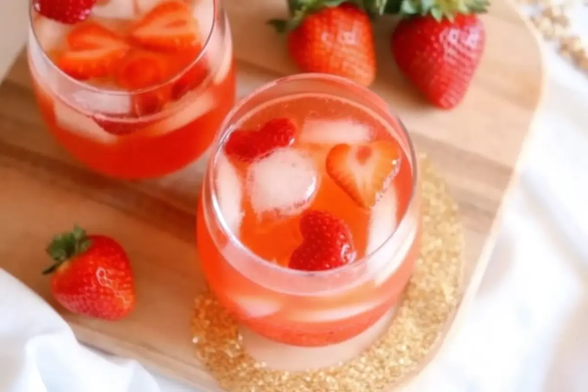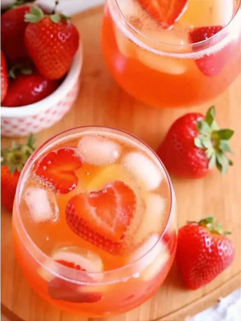 Finally, serve over ice in individual glasses, garnishing each with the reserved strawberry hearts for that perfect Valentine’s Day presentation.