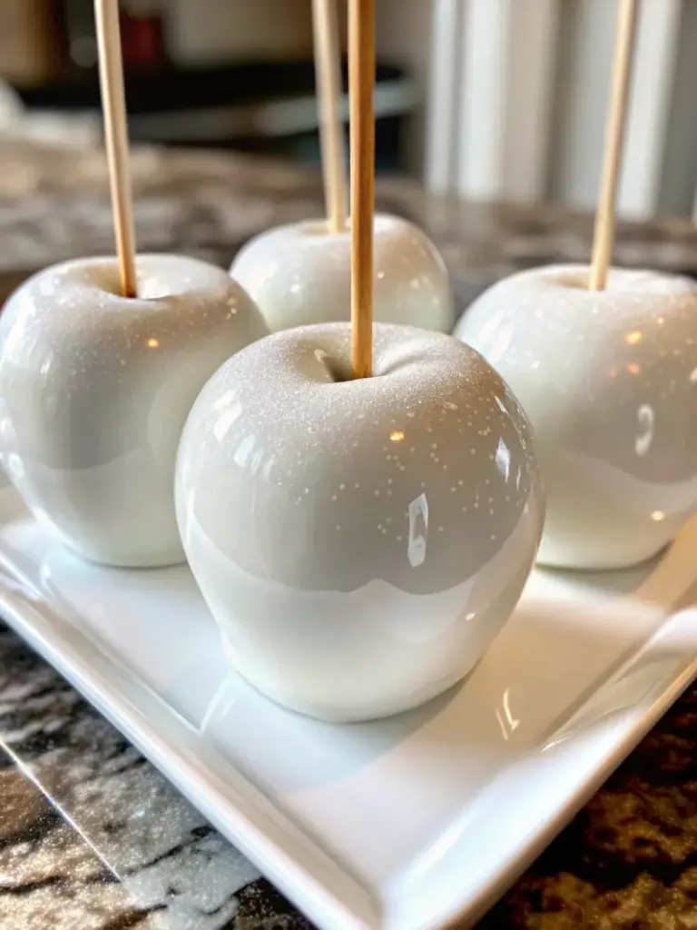 White Sparkle Candy Apples with crisp apples coated in a glossy white hard candy shell and finished with edible glitter for a dazzling, party-ready treat.