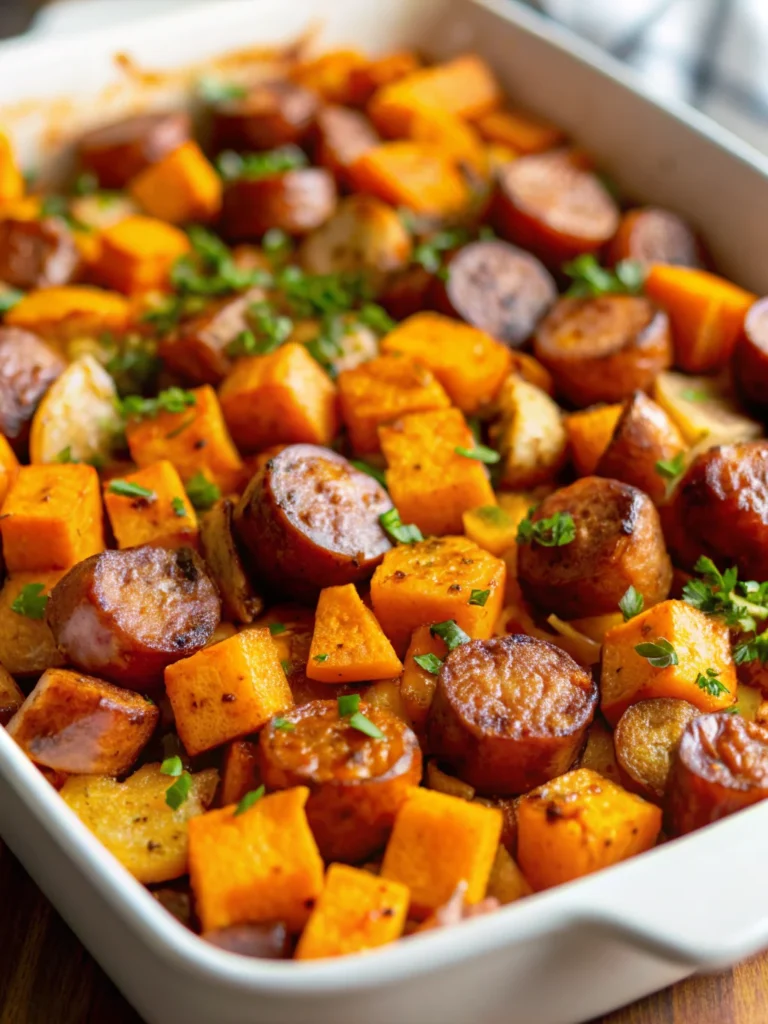 - Roast 25–30 minutes, stirring halfway through, until sweet potatoes are tender and sausage is golden.