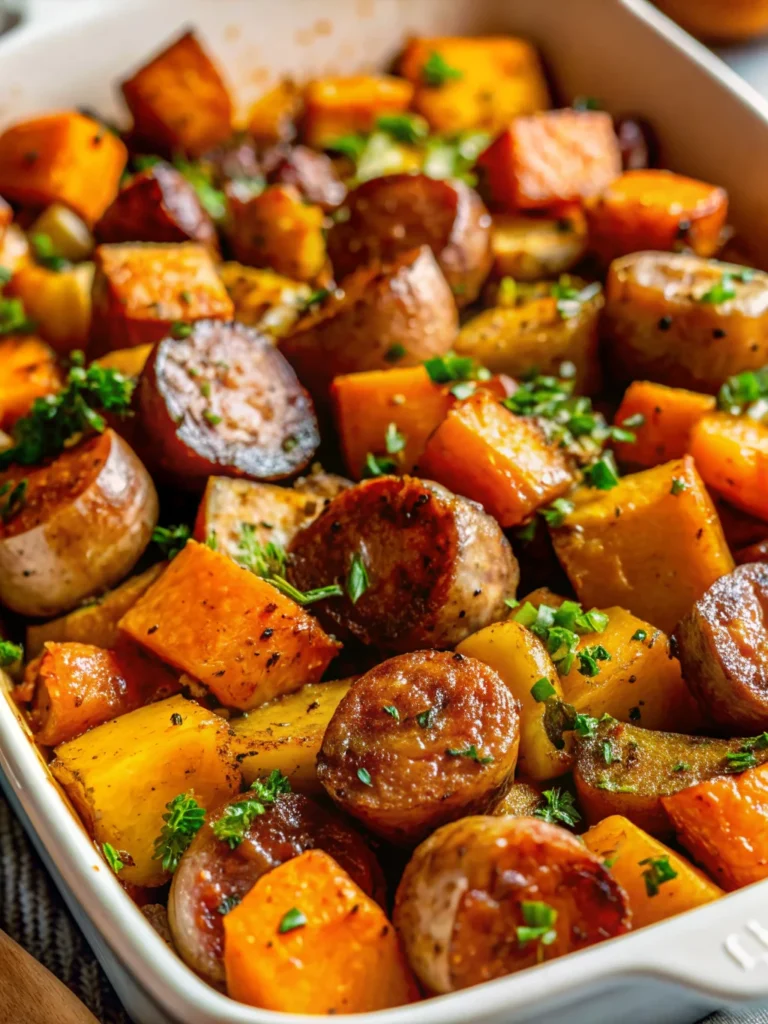 This one-pan wonder combines the savory richness of perfectly seasoned sausage with the natural sweetness of roasted sweet potatoes, all brought together by a irresistible honey garlic glaze that will have your family asking for seconds.
