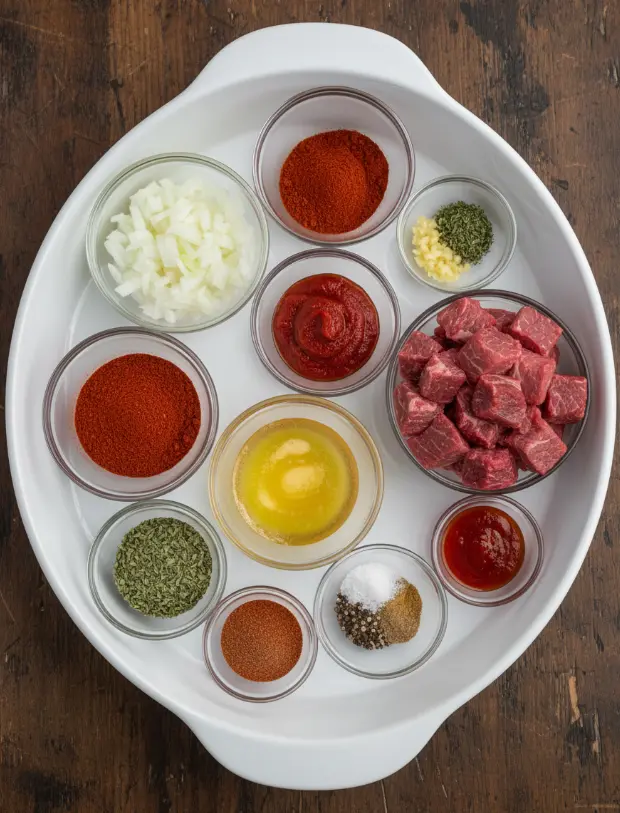 Creating this Award Winning Texas Chili starts with quality ingredients that evoke the rugged essence of Texas ranch life. Imagine the sizzle of beef in ghee, the earthy aroma of toasted oregano wafting through your kitchen—it’s sensory magic. Here’s a clear list for 8-10 servings, with substitutions for flexibility: