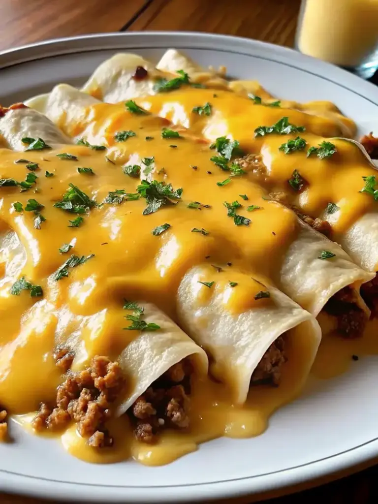 Pour the gravy over the assembled enchiladas, cover with foil, and bake for 25 minutes. Remove the foil and bake for another 10 minutes until bubbly and golden. Let it cool for a few minutes—garnish with fresh herbs or extra cheese for that Instagram-worthy finish.