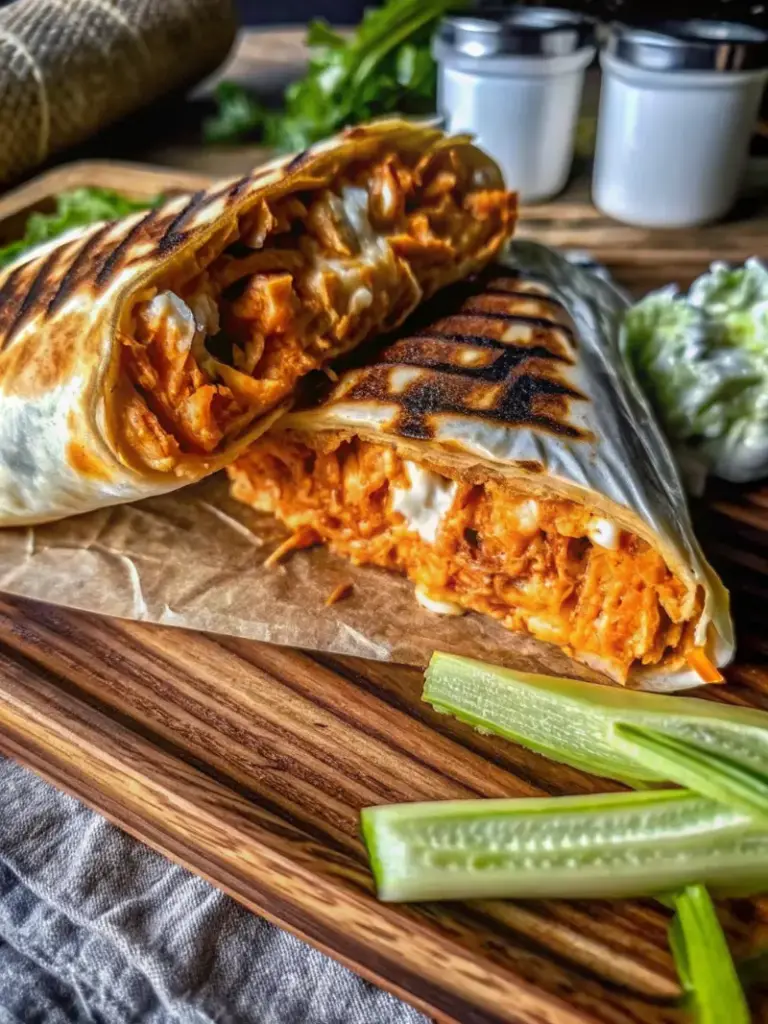 A spicy, creamy Buffalo Chicken Caesar Wrap packed with protein, crisp romaine, and bold flavors, perfect for a quick high-protein lunch or dinner.