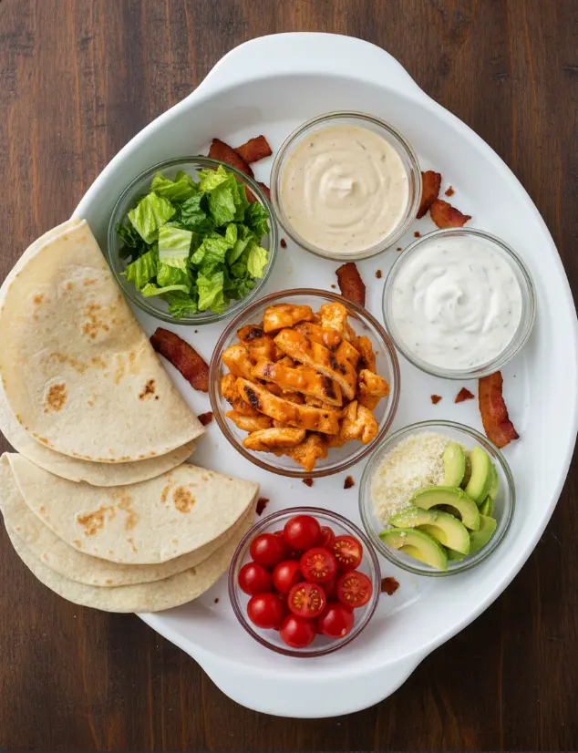 Spread 2 tablespoons of ranch dressing down the center of each tortilla, creating a creamy foundation. Layer generously with buffalo chicken, followed by the Caesar-dressed romaine. Sprinkle 1 tablespoon of grated Parmesan cheese on top, then add any optional ingredients like cherry tomatoes or avocado. Ensure the creamy chicken filling is sandwiched between greens to prevent the tortillas from getting soggy.