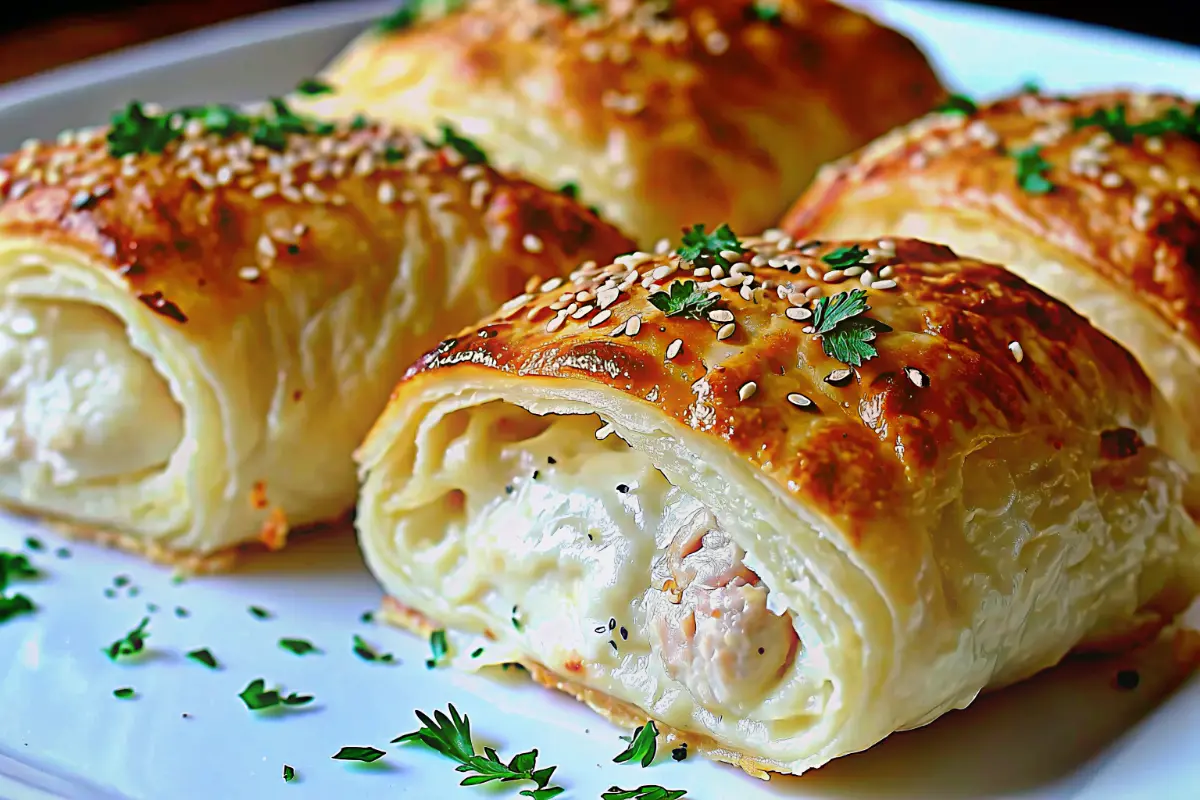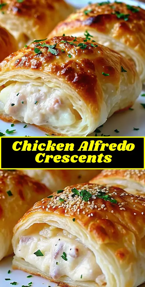 Buttery, flaky crescent rolls filled with creamy chicken Alfredo and melted cheese, baked until golden for a fast and comforting meal.