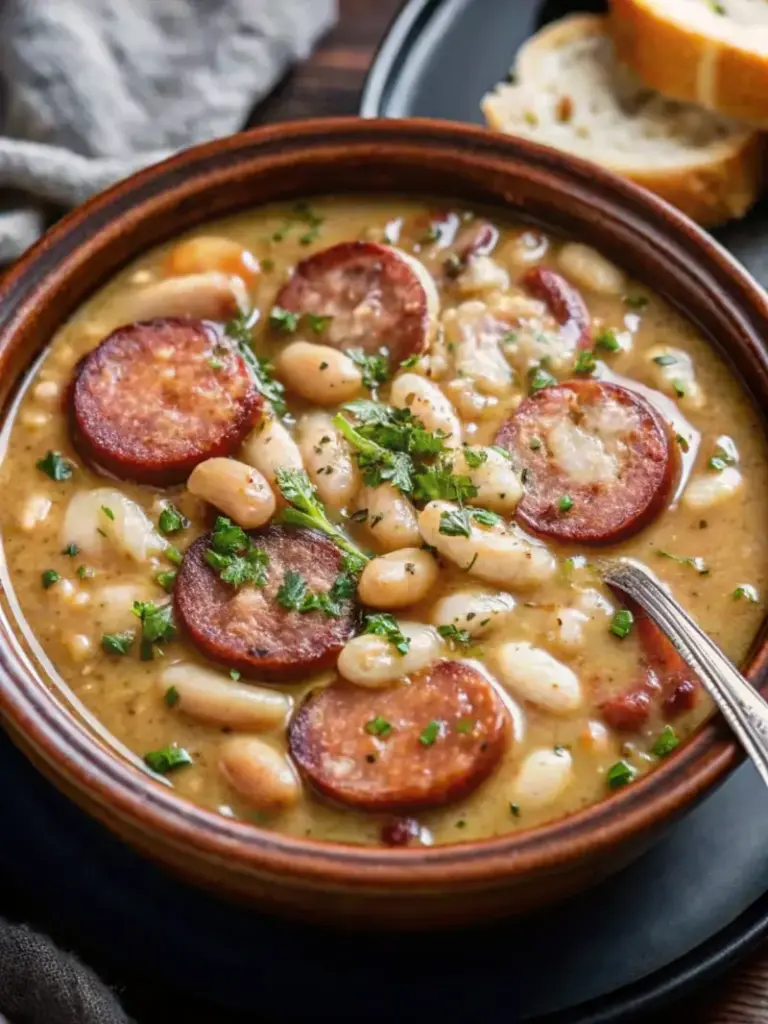 Stir in heavy cream if desired for luxurious richness. Taste and adjust seasoning one final time. Ladle into bowls, garnish with fresh chopped parsley, and serve immediately with crusty bread for the complete creamy bean soup kielbasa experience.