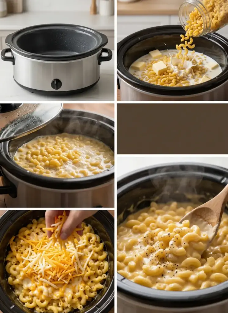 Quickly lift the lid, sprinkle in all shredded cheeses (cheddar, American, Monterey Jack), and stir until mostly incorporated. Replace lid immediately to retain heat. Cook covered for 15-30 more minutes until pasta is tender and cheese is bubbly-melty. Actionable hack: Shred your own cheese—it melts 25% smoother than pre-shredded (per cheese expert tests).