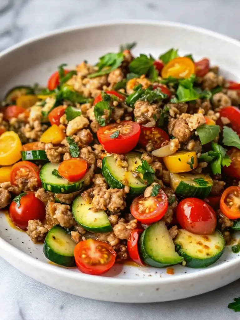 Ground Turkey and Zucchini Skillet is a quick, healthy one-pan meal made with lean ground turkey, tender zucchini, tomatoes, and simple spices. This easy 30-minute dinner is packed with protein and vegetables, making it perfect for busy weeknights and meal prep.