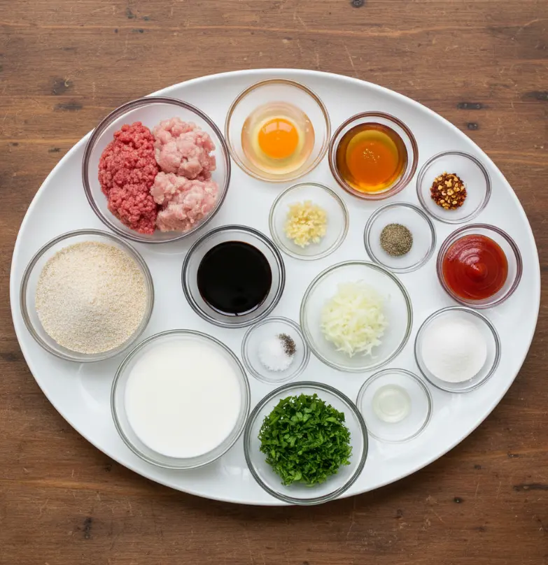 In a large mixing bowl, gently combine ground beef, ground pork, breadcrumbs, egg, milk, minced garlic, grated onion, soy sauce, salt, black pepper, and chopped parsley. Mix until just incorporated—overmixing creates dense, tough meatballs.