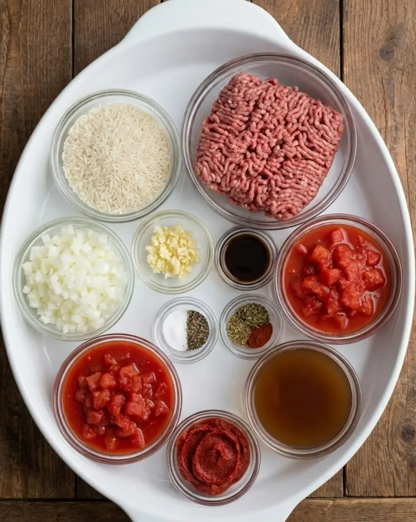 - Mix ground beef, uncooked rice, onion, Worcestershire sauce, salt, and pepper until just combined.