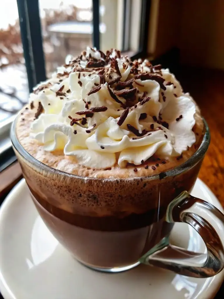 - Top and garnish: Add a dollop of whipped cream, then garnish with chocolate shavings, crushed peppermint, or cinnamon. Serve immediately and enjoy.