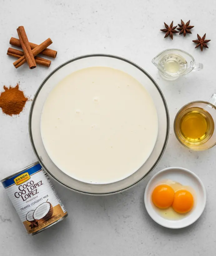 Creating the perfect batch of homemade coquito requires quality ingredients that work in harmony. Here’s everything you’ll need: