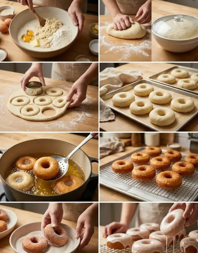 Gently turn dough onto a lightly floured surface—no punching down needed! Roll to ½-inch thickness. Use a 3-inch donut cutter (or biscuit cutter + small round for holes) to stamp out shapes. Re-roll scraps once for max yield. Place on parchment-lined trays, cover loosely, and proof 1-2 hours until puffy. Trick: Poke test—dough should spring back slowly. Tailored for beginners: This yields 12 donuts + holes.
